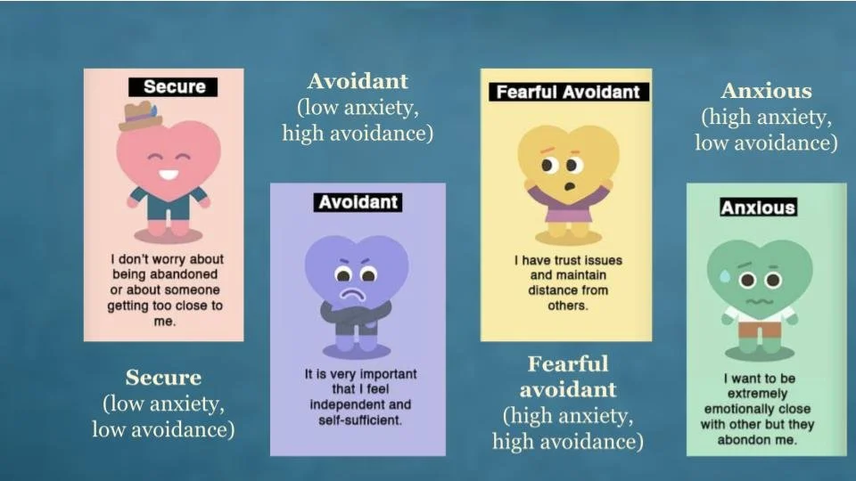 We’re always playing with dynamics of attachment and anxiety. People with secure attachment have low anxiety and low avoidance. People who are avoidant have low anxiety and high avoidant, in contrast with people who are fearful avoidant - high anxiety and highly avoidant. Someone who is anxious has high anxiety and a low avoidance.